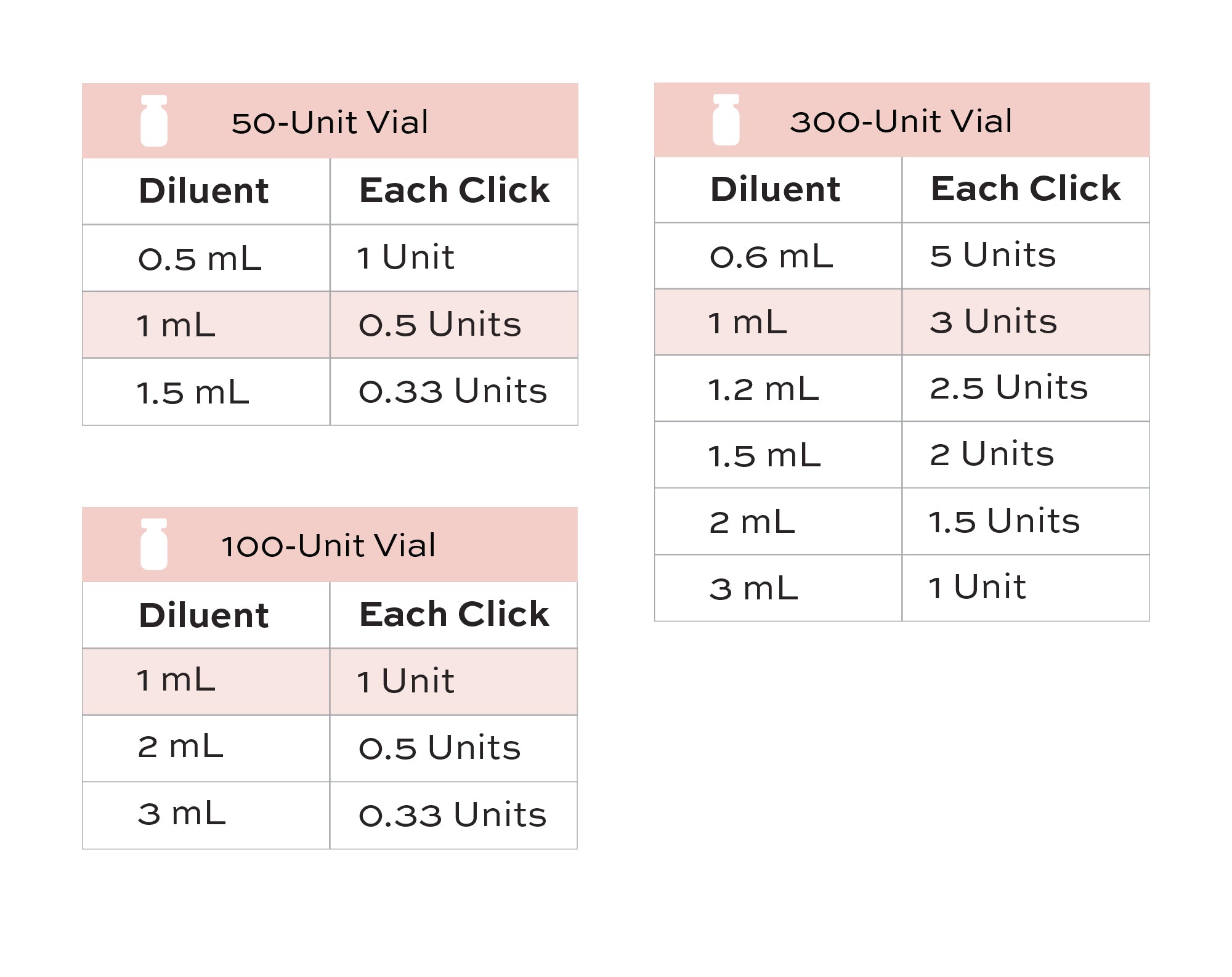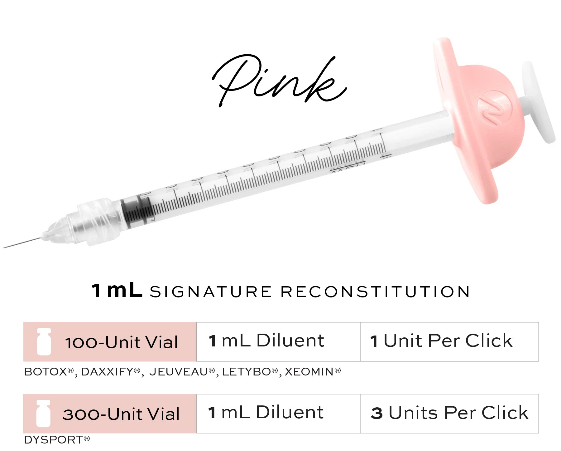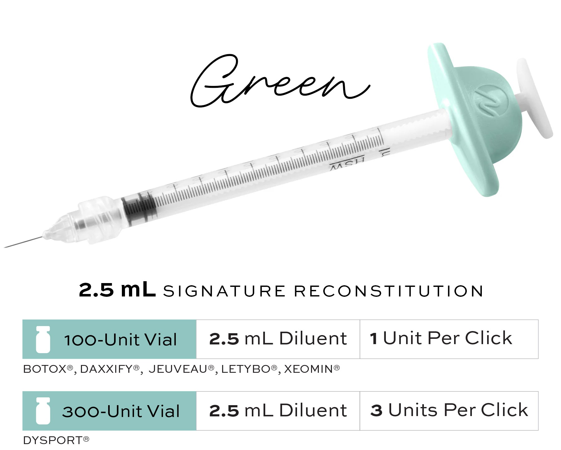 NavaClick™ comes in three colors, each with its own signature reconstitution, designed to effortlessly deliver precise aliquots with each audible tactile click. See the flexible reconstitution charts at the bottom of the page.