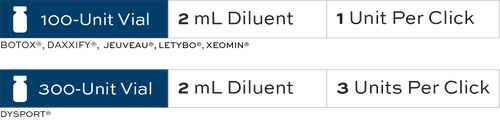 Sterile, single-use essentials for injecting neurotoxin, featuring a metered-dose syringe that delivers .02 mL with an audible and tactile click.