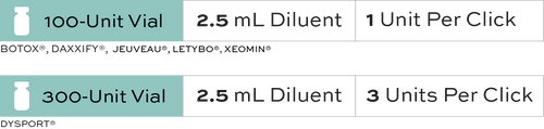 Sterile, single-use needle and syringe for injecting neurotoxin, featuring a metered-dose syringe that delivers .025 mL with an audible and tactile click.